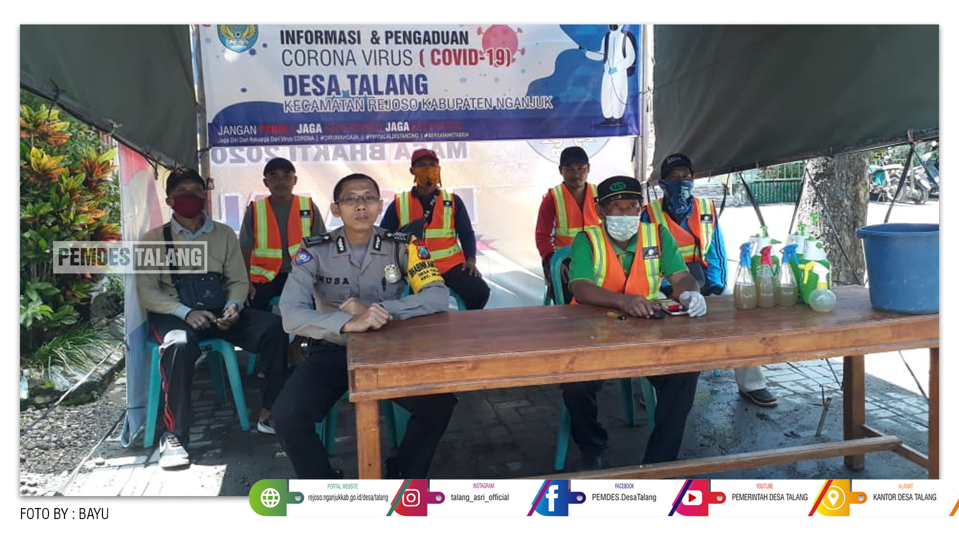 Sabtu, 04/04/2020 sejumlah perangkat Desa Talang di bantu oleh jajaran TNI dan POLRI yang berada di wilayah Desa yaitu BHABINKAMTIBMAS dan BABINSA selalu siaga di POSKO INFORMASI DAN PENGADUAN VIRUS CORONA COVID19,