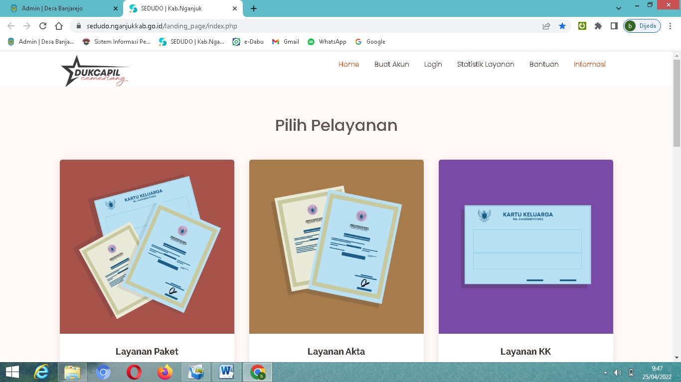 Baru-baru ini, data adminduk terpusat di SIAK (Sistem Informasi Administrasi Kependudukan), artinya server data base sekarang ada di SIAK terpusat dan terintegrasi di seluruh Indonesia. Apabila aplikasi SEDUDO tidak dapat digunakan, masyarakat dapat mengakses lewat google dengan alamat http://sedudo.nganjukkab.go.id . Pelayanan yang semula cepat, kini prosesnya lama dikarenakan perubahan sistem. Masyarakat diharapkan bersabar dengan kondisi ini, Dukcapil kabupaten nganjuk berusaha memgoptimalkan kondisi ini.