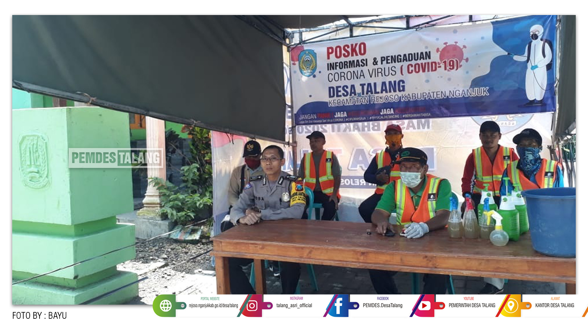 Sabtu, 04/04/2020 sejumlah perangkat Desa Talang di bantu oleh jajaran TNI dan POLRI yang berada di wilayah Desa yaitu BHABINKAMTIBMAS dan BABINSA selalu siaga di POSKO INFORMASI DAN PENGADUAN VIRUS CORONA COVID19,