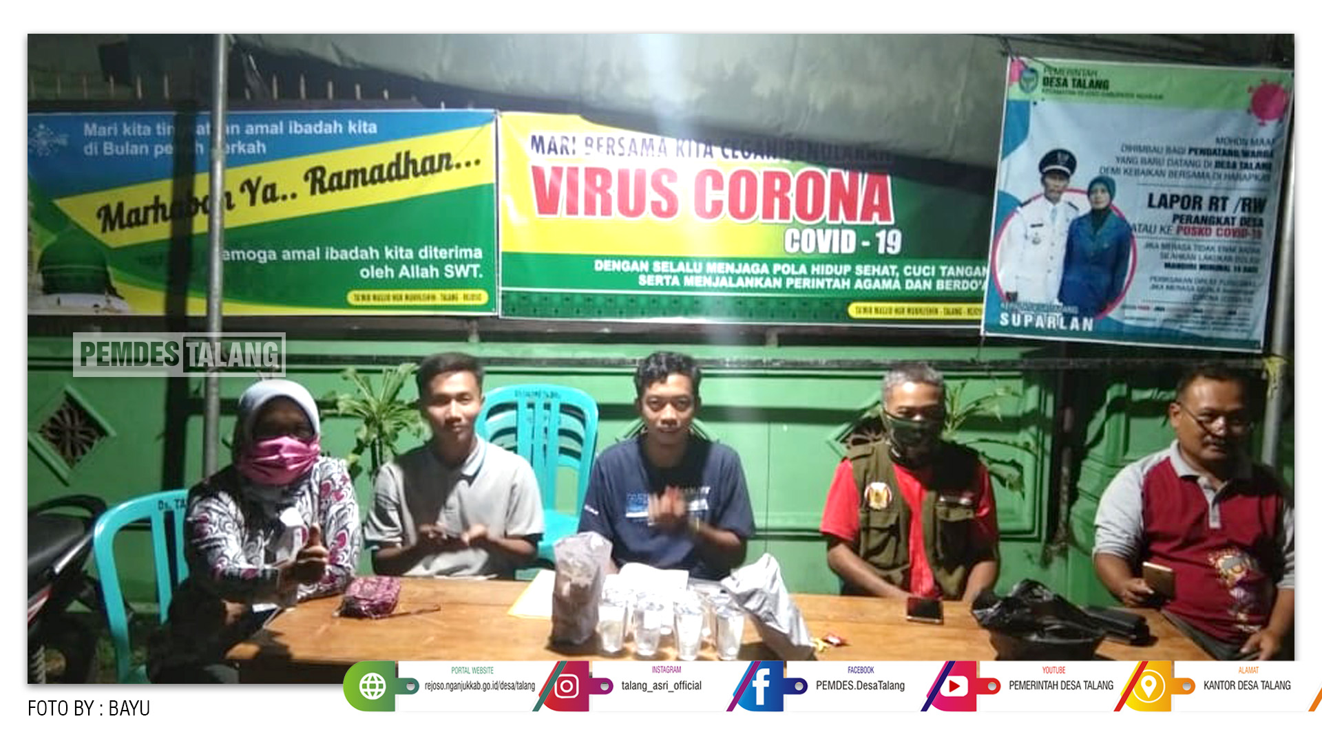 PEMDES TALANG, Selasa,07/04/2020 Pelaksanaan kegiatan Posko COVID19 sesuai dengan jadwal petugas jaga yang telah di edarkan. Kegiatan akan ini akan terus berlangsung sampai wabah COVID19 ini berkurang di wilayah Desa Talang Kecamatan Rejoso Kabupaten Nganjuk