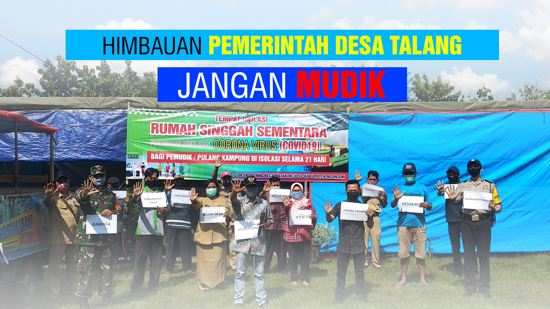 Kepala Desa Talang Kecamatan Rejoso Kabupateng Nganjuk beserta Babinkamtibmas, Babinsa dan jajaran Lembaga Desa Talang menghimbau agar tidak mudik bagi warga masyarakat Desa Talang yang berada di Perantauan baik luar kota maupun luar negeri. Apabila terpaksa untuk mudik akan disiapkan tempat isolasi atau Rumah Singgah Sementara selama 21 hari yang sudah di siapkan oleh PEMERINTAH DESA TALANG.