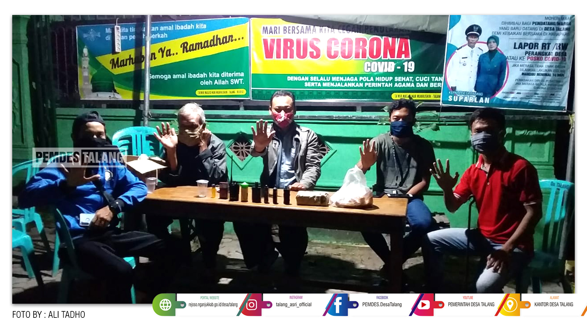 PEMDES TALANG, Jum'at (17/04/2020) anggota relawan COVID19 masih semangat dalam menjalankan jaga posko relawan COVID19 yang ada di Desa Talang. Posko ini di bagi 2 bagian yaitu Posko 1 berada di depan Kantor Desa Talang dan Posko 2 di Jalan Raya sekaligus akses jalan utama masuk Desa Talang.