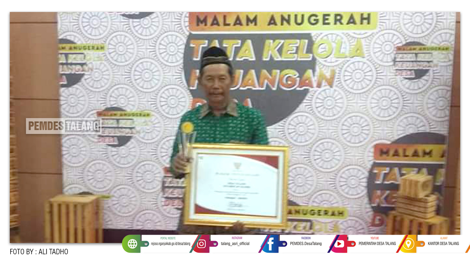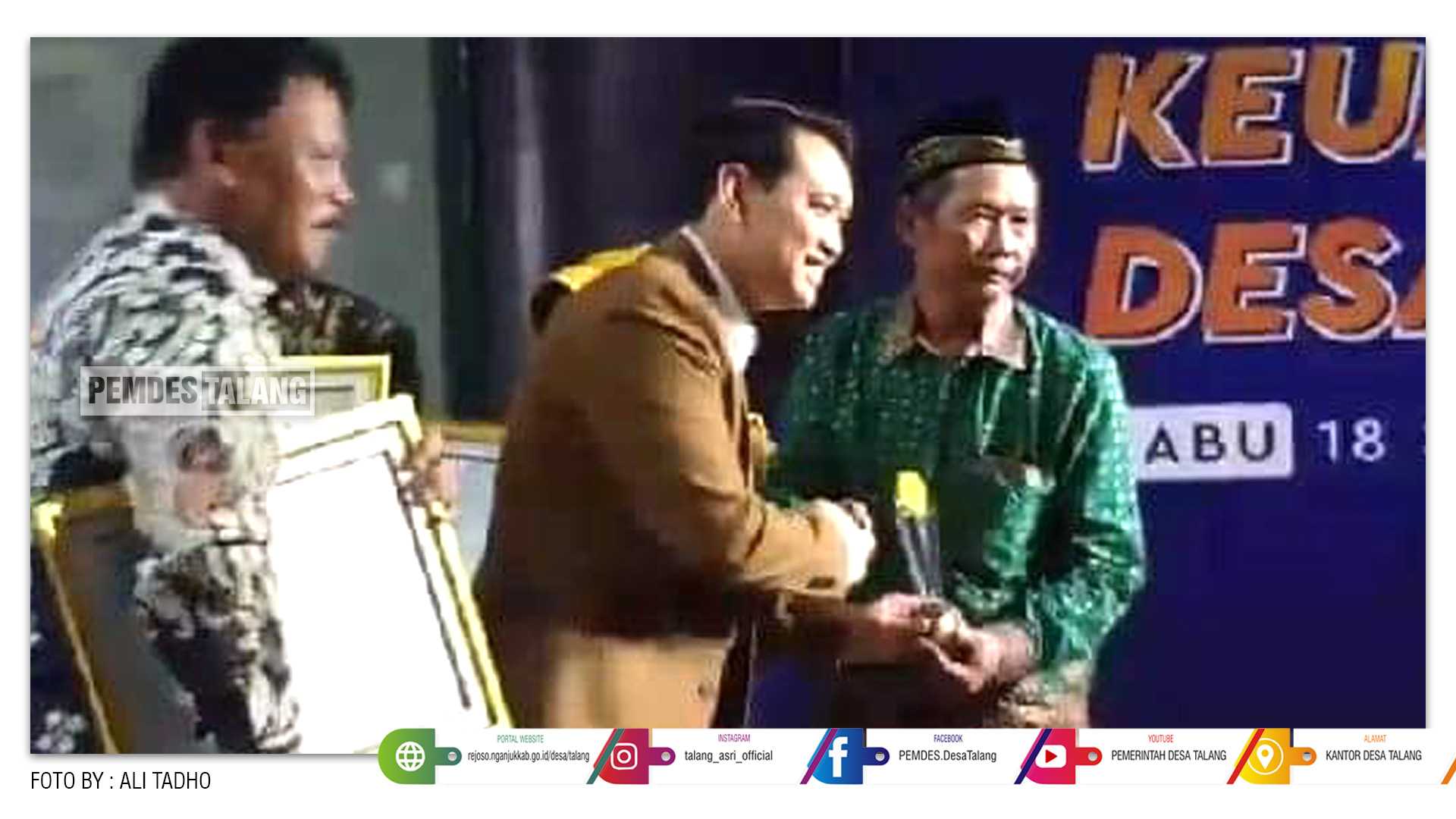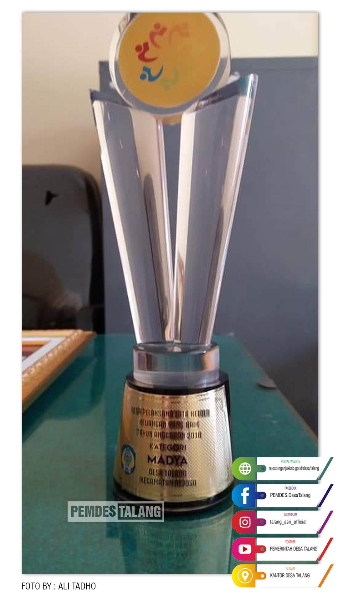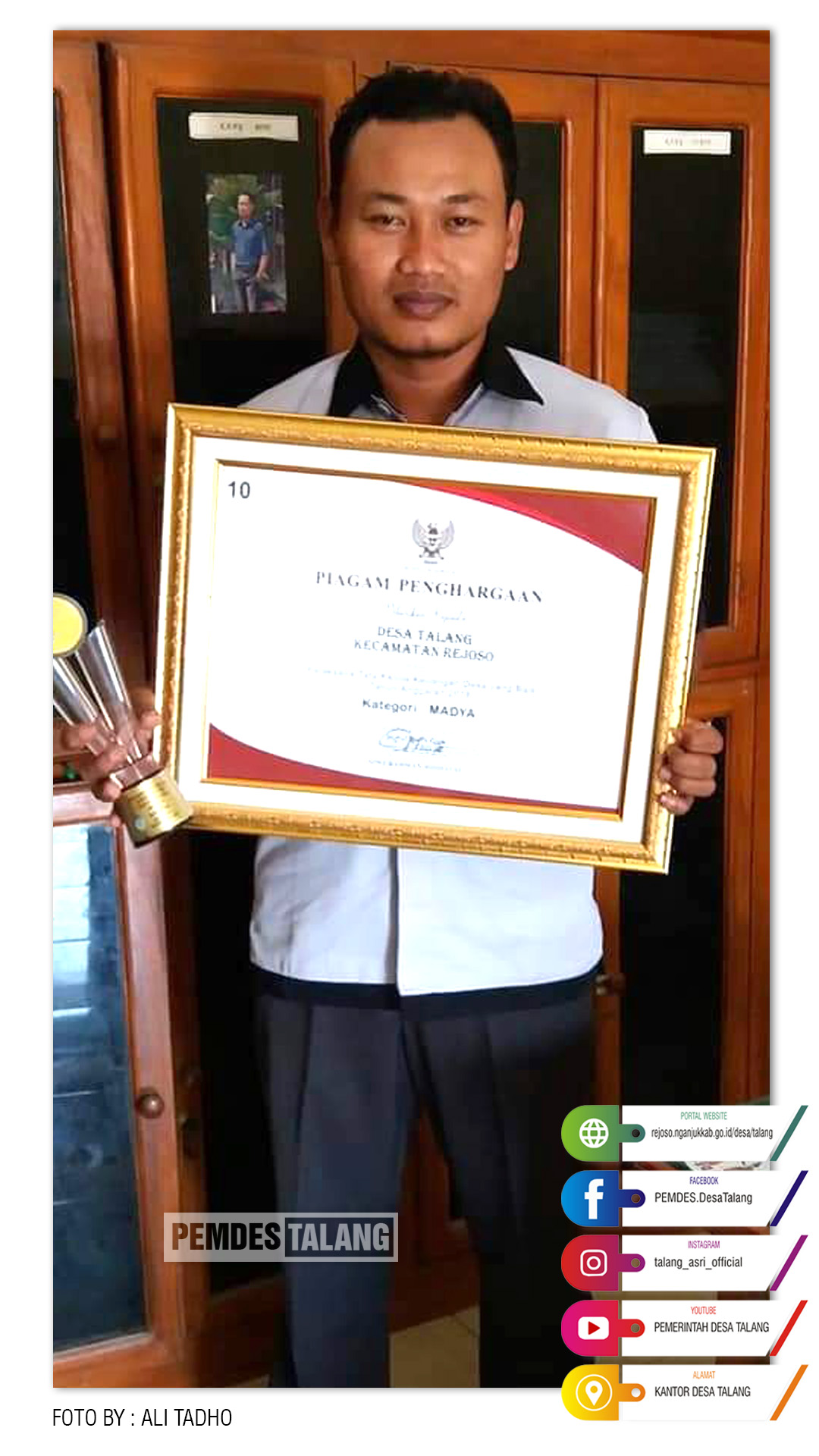 Desa Talang Kecamatan Rejoso Kabupaten Nganjuk Telah Menerima Penghargaan Predikat Madya dalam “Lomba Pengelolaan Keuangan Desa Tingkat Kabupaten Nganjuk tahun 2018”. Penghargaan diserahkan secara langsung oleh Bapak Bupati Nganjuk.